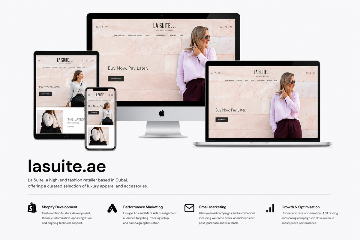 The final result is a modern, scalable Shopify platform that combines strong technical foundations with a refined brand experience, enabling La Suite to operate efficiently while delivering a premium online presence aligned with its position in the Dubai fashion market.